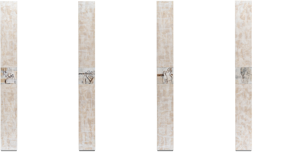 Häutung Serie I | Je 135 x 15 x 6 cm, 2019, Acryl, Japanpapier, Zeichnung auf Holzkörper